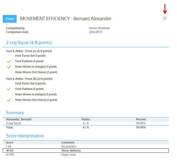 A PDF printout of the result page can be generated by tapping the printer icon.