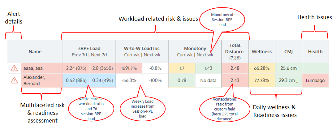 The dashboard combines athletes’ individual daily wellness score, health status and evidence-based workload metrics linked to the apparition of injuries (acute:chronic workload ratios -ACWR- and week-to-week load increase) to provide an immediate global picture of athletes’ level of risk and level of readiness (represented by the color of the first column).