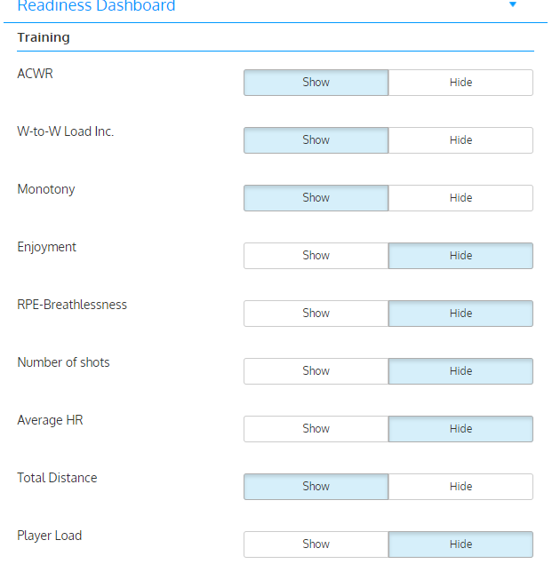 The dashboard is pre-configured with internal load, wellness and health metrics proven to be effective markers of athlete readiness. These items are presented below. The dashboard can also be customized in Team settings - Readiness Dashboard to include the metrics and calculations of your choice.