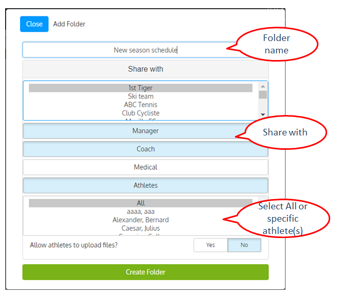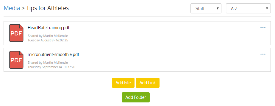 This module allow you to share documents, programs, videos with staff and athletes. To open the module, select the Media sharing option from the Team menu.