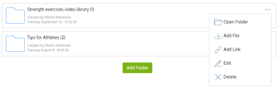 Once a folder is open, it's content is automatically displayed. To add a file, select the Add file button, select the file and save.To add a link (video link for example), select Add link. You can also create a subfolder by selecting the Add Folder button